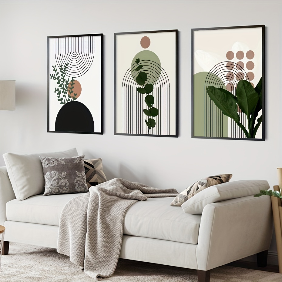 Bring the serenity of nature and the vibrancy of bohemian style to your living room with this captivating collection of unframed wall art. Choose from canvas, prints, or posters, each featuring an abstract rendition of green plants, leaves, vases, and sun lines.